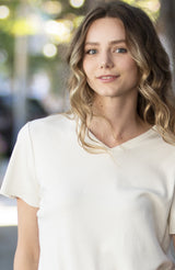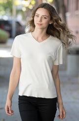 This shirt is undyed and unbleached and made of 70% organic cotton and 30% Hemp.