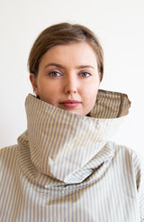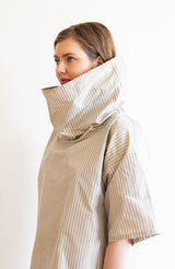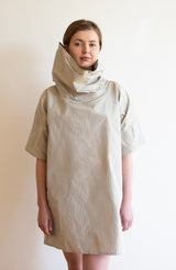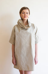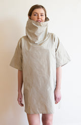 The 100% silk fabric is woven to take form. This silk dress is designed to be malleable and change shape based on body movement. To be worn boxy or with a belt.