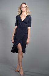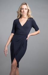 Wrap dresses are comfortable and flattering on all body types. This dress is knee length with elbow sleeves. Typical of wrap dresses, it drapes elegantly, wraps around the body and crosses at the chest.